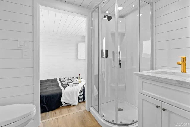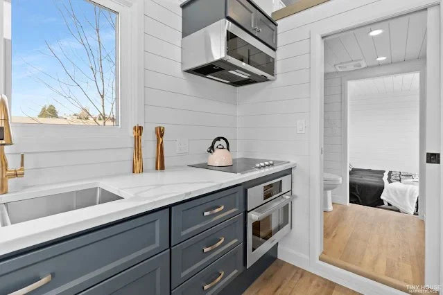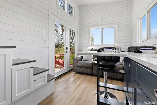 Per una vita comoda e spaziosa con le sue casette su ruote. Con diverse dimensioni disponibili 10x3,5, possono soddisfare perfettamente le tue esigenze. Entra nella bellezza di un soggiorno e di una cucina open-space, progettati per massimizzare spazio e funzionalità. Sotto le scale troverai un sacco di spazio per riporre gli armadi, permettendoti di utilizzare in modo efficace ogni centimetro della tua casa mobile. La camera da letto principale, situata al primo piano, si apre sul patio, permettendovi di godervi la vita all'aria aperta a portata di mano. Il bagno è dotato di un miscelatore trilocale completo e la moderna cucina comprende forno, frigorifero e microonde da incasso. La cucina artigianale è composta da legno massello e un lussuoso piano di lavoro in quarzo, completato da un pratico piano cottura.