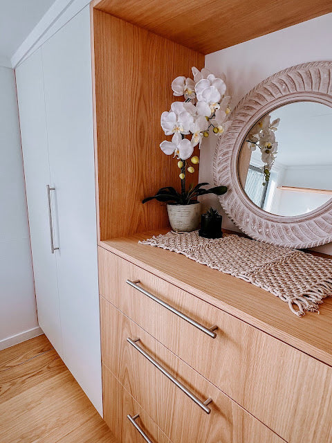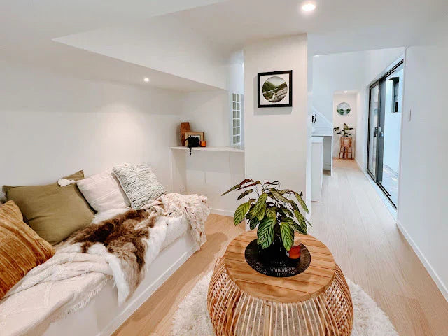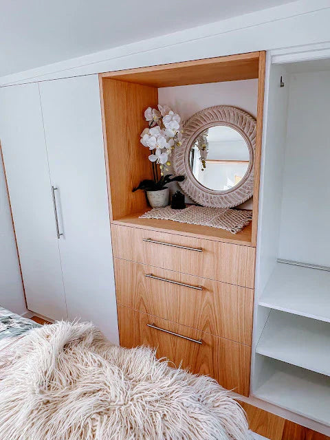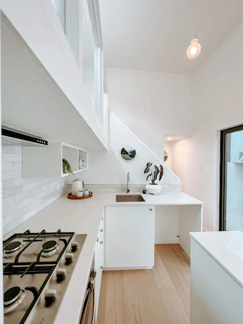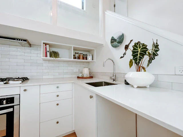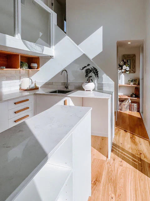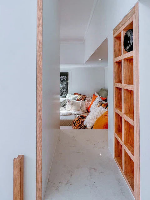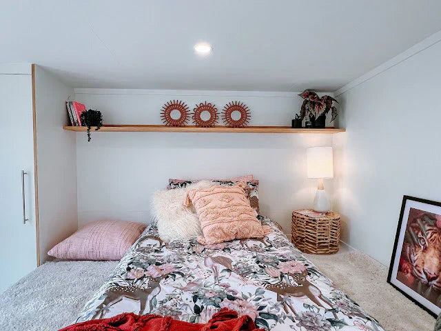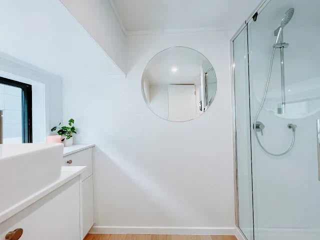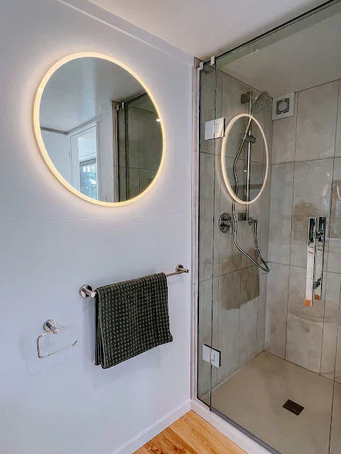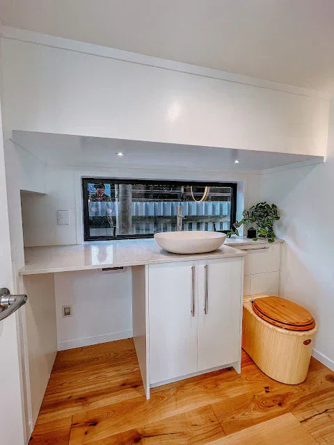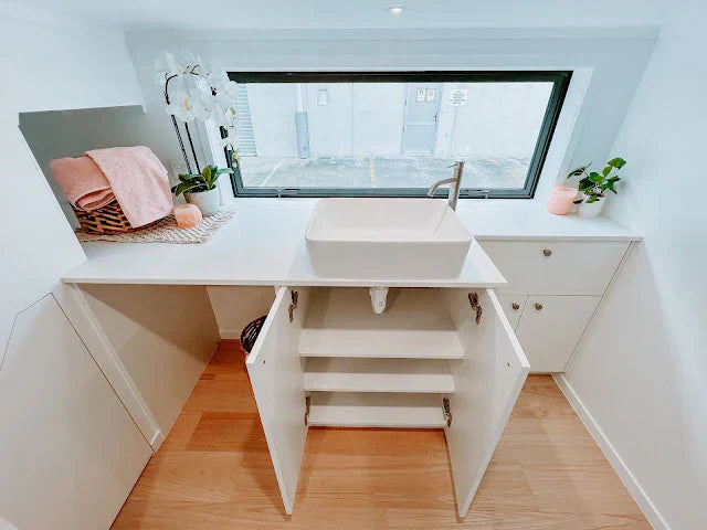 Il bagno di Sophie è dotato di WC con sciacquone (disponibile l'opzione di compostaggio), lavandino con specchio e ventilatore/luce da bagno con interruttore a parete. I controsoffitti in superficie solida aggiungono un tocco di eleganza allo spazio.