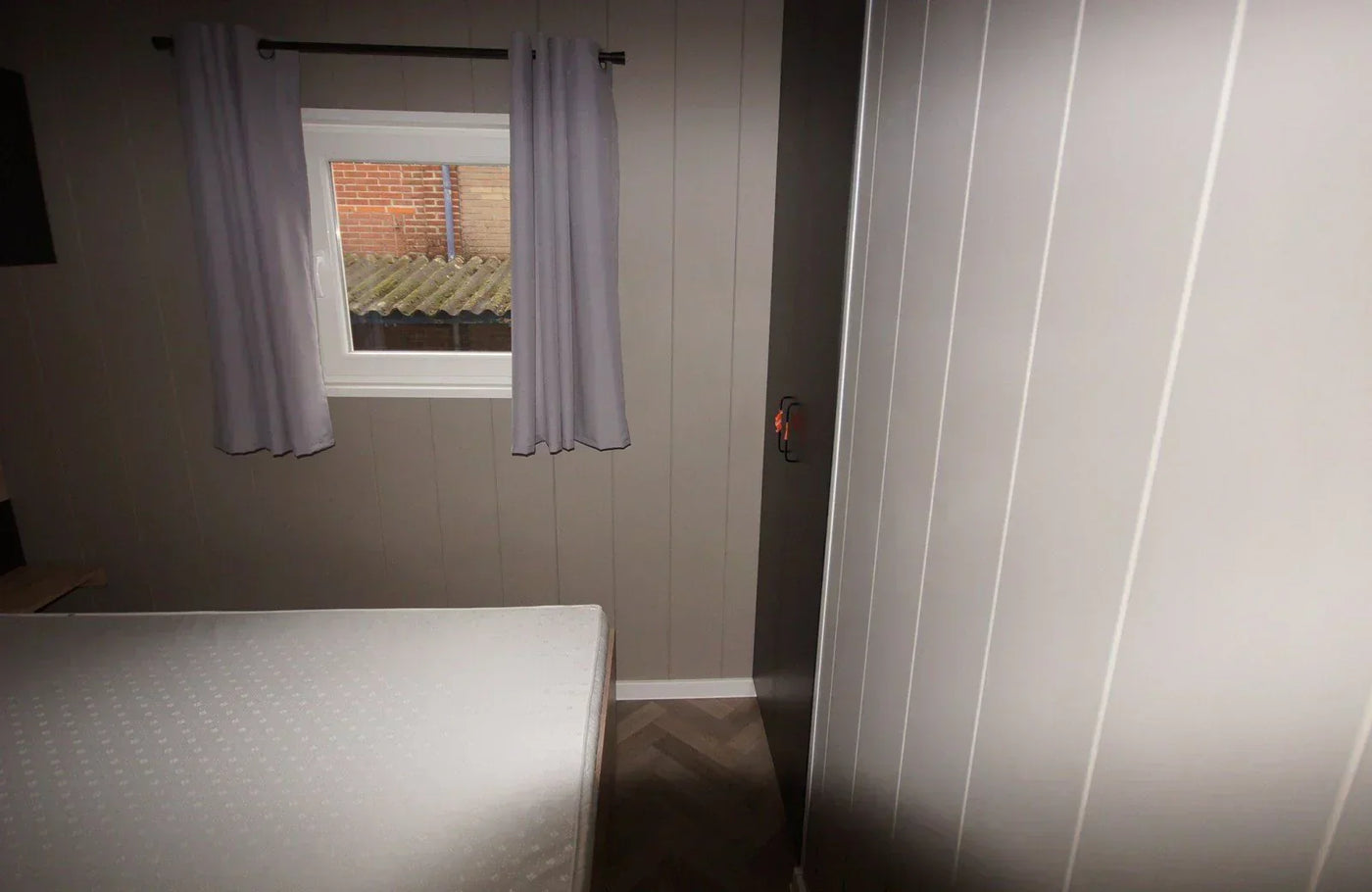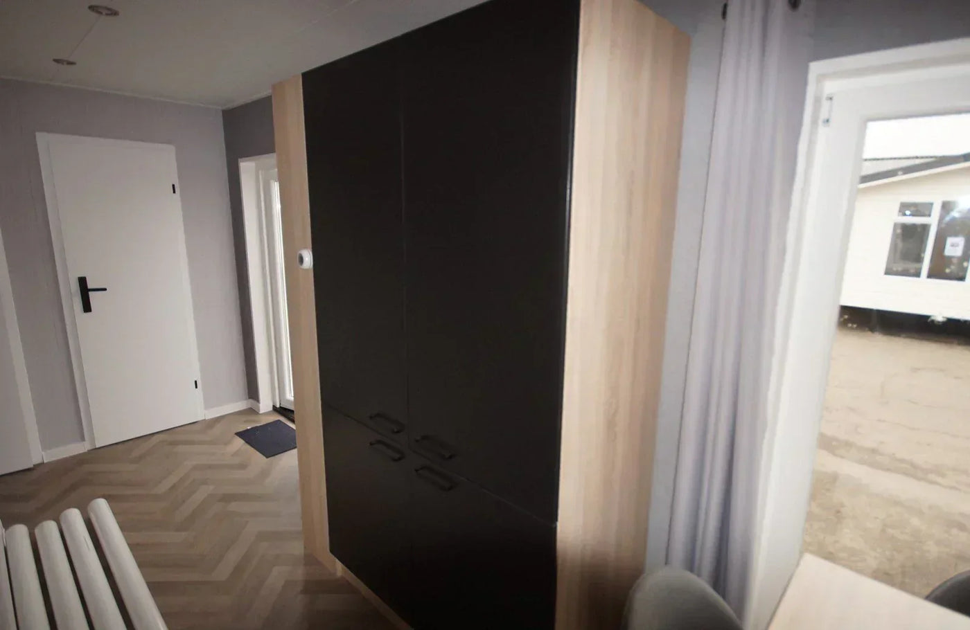 Accogliente soggiorno con divano ad angolo e tavolino, finestre panoramiche, zona pranzo con 4 sedie e finestra. C'è anche un ampio ripostiglio a doppia porta. La lussuosa cucina nera, molto spaziosa, è dotata di diversi elettrodomestici Whirlpool, tra cui un forno, un grande frigorifero/congelatore, un piano cottura a gas a 4 fuochi con cappa aspirante e un lavello con miscelatore. Tra i due angoli della cucina si trova un bancone bar con due sgabelli. La camera da letto 1 ha un ampio letto matrimoniale e un ripostiglio sopra e davanti al letto. La camera 2 ha due ampi letti singoli e un armadio. Il bagno ampio e lussuoso è dotato di una grande doccia, un lavabo con mobiletto e specchio e servizi igienici.