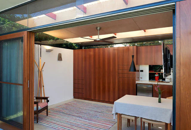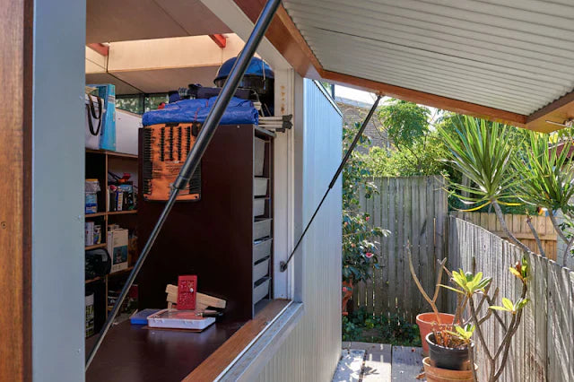 All'interno, attraverso una serie di porte scorrevoli in vetro, si trovano le tre stanze che compongono lo studio. La camera da letto principale è dotata di un letto ribaltabile, di una zona pranzo e di posti a sedere. Accanto c'è il bagno e la lavanderia della casa. La terza stanza funge da ripostiglio e spazio di lavoro.