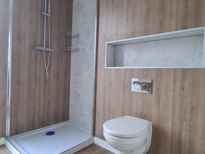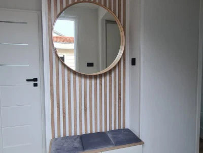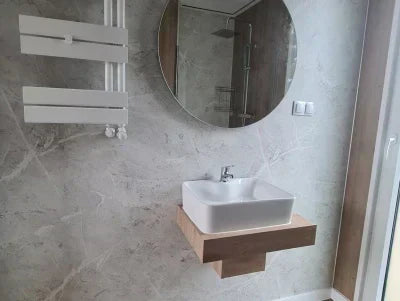 Bagno con mobile con specchio rotondo, doccia e WC sospeso P