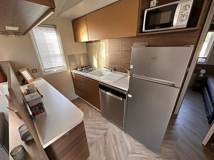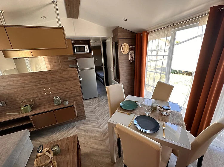 CASA MOBILE RESIDENZIALE IRM HAMPTON Attrezzatura:Grande frigorifero/congelatorePiano cottura a gas 4 fuochilavastoviglie, microondePredisposizione lavatriceLetto estraibile nella cameretta dei bambiniCombinazione Oscuranti...